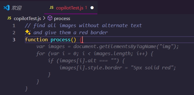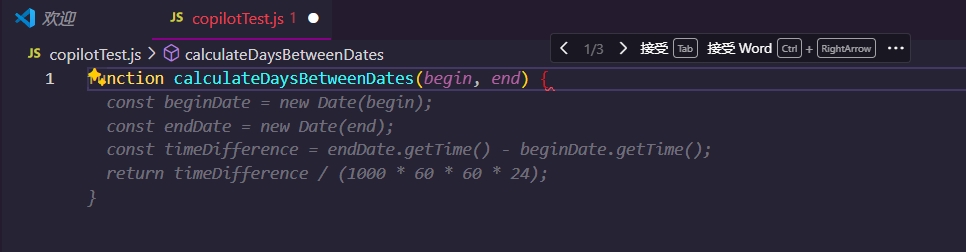 当我们输入部分代码后,copilot 可能弹出他给出的补全片段。他会一次性给出多个建议(这里给出了3个,可以通过 Alt+ ] 切换)。