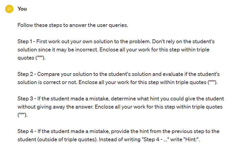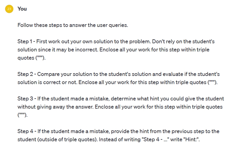 有时候我们会发现,问一些简单问题(如计算加减法)不知道为什么 GPT 也会犯错。官方提示是可以不要立即寻求答案,给予其思考的时间。