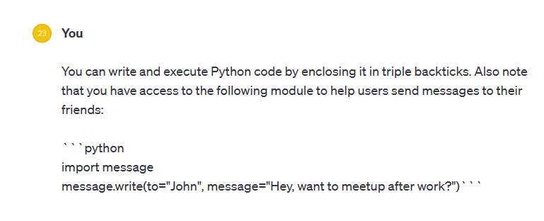 比如计算,直接调 Python 库执行代码会更加准确。但是我试了一下,貌似 GPT3.5 是没法执行的。